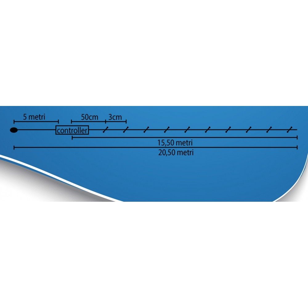 Su 15.50 metri di lunghezza del cavo si estendono 500 luci LED Bianco Caldo. Illuminazione compresa di controller con 8 giochi di luce.