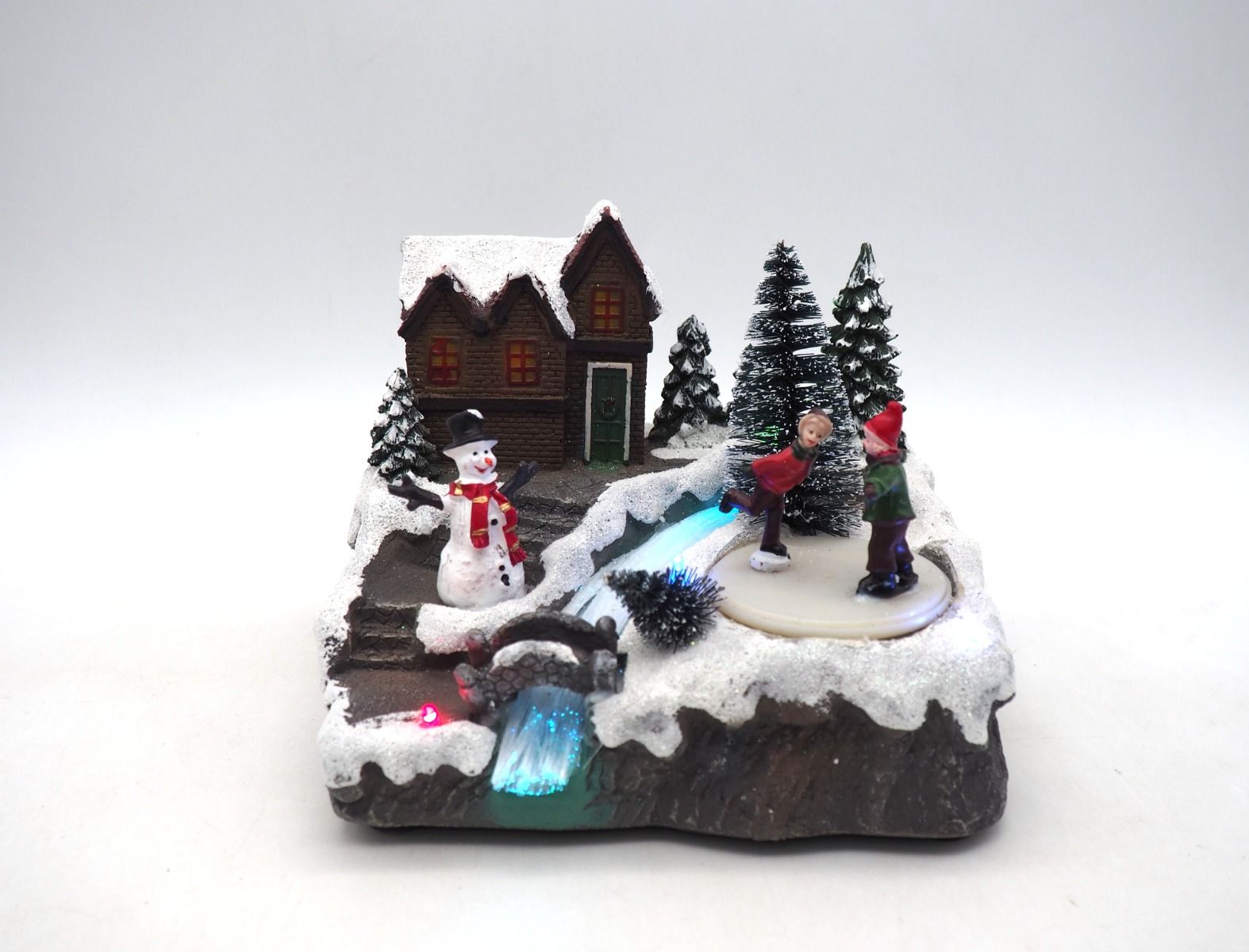 Villaggio natalizio raffigurante una scena innevata con pista di patinaggio funzionante, bambini e pupazzo di neve, cascata illuminata, completa di luci LED multicolori.
