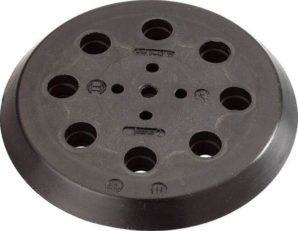 Platorello adesivo, forato, per fresatrice rotoorbitale, con rivestimento adesivo a velcro, autoadesivo, per dischi di carta abrasiva con parte inferiore di velours a velcro, per la rapida sostituzione dei dischi abrasivi senza utensile.