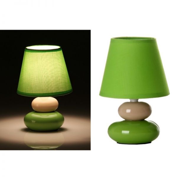 Lampada moderna per comodino pop in ceramica verde con decorazione in pietra e schermo in cotone conico.