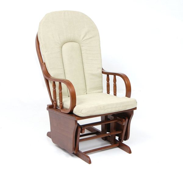 Poltrona dondolo oscillante con struttura in legno massello verniciato color noce, cuscino a lastra imbottito in poliestere di colore beige
