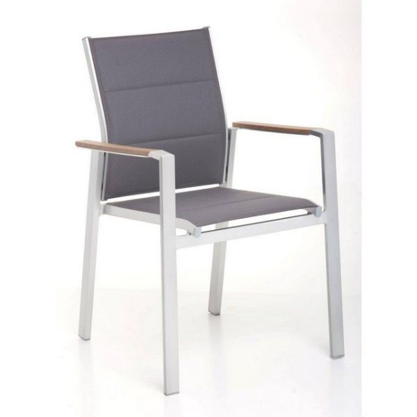 POLTRONA KEY WEST impilabile, con braccioli. Struttura in alluminio verniciato, finitura in acciaio spazzolato, inserti in polywood, schienale e seduta in textilene, imbottito.