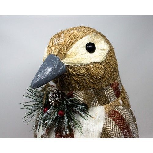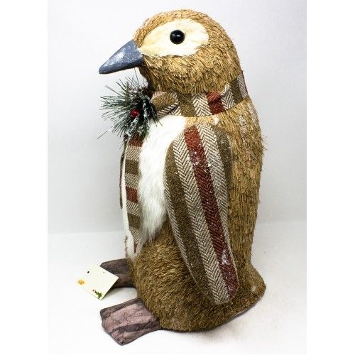 Il Pinguino è rivestito in paglia dello stesso colore della juta, attorno al collo ha un fiocco con piccole pigne e bacche.