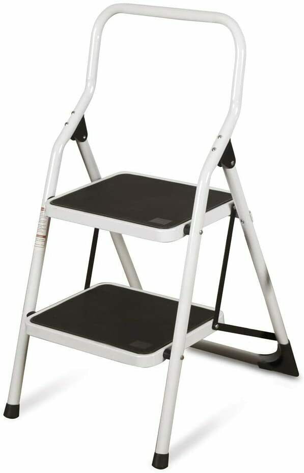 Sgabello per uso domestico 2 Gradini in metallo verniciato bianco, pratico e leggero con ampie pedane antiscivolo, richiudibile per riporlo in qualsiasi spazio