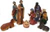 Set da 8 statuine Natività completa in resina. Altezza media 19 cm circa, intesa per il personaggio più alto San Giuseppe, in proporzione gli altri personaggi sono di dimensioni più piccola perché inginocchiati o piegati per guardare Gesù Bambino.