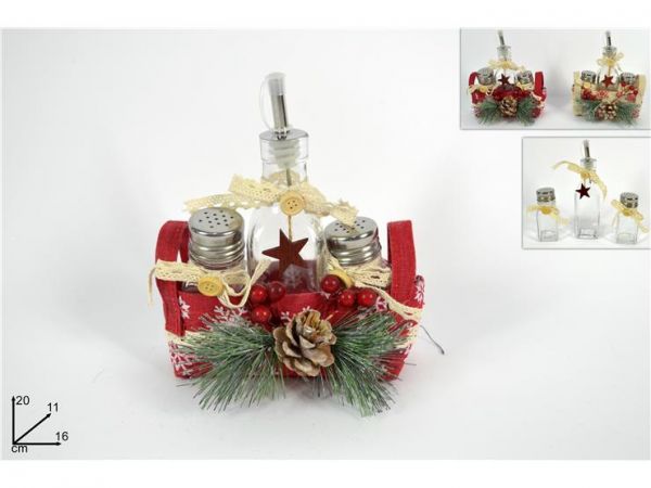 Per imbandire la tua tavola natalizia non dimenticare il nostro set olio,sale e pepe adagiati su un fantastico cestino di natale addobbato con bacche e pigne.