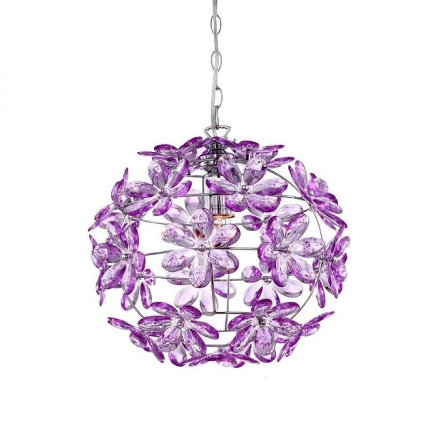 Sospensione realizzata con montatura in metallo cromata e fiori in metacrilato viola. La brillantezza dei componenti in acrilico è pari a quella del cristallo.